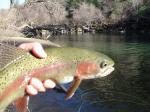 Another skaterat turned fly fisherman. I have skated just about every skatepark built in California. I have never skated the pipe coming out of the dam, but about two or three years ago I used to watch the youngsters skate the pipe below the dam while I was hauling in 20 to 24 inch fish. I think that is why the water district put in a new fence. The fence is broken, but the pipe is still there. I say we have an old timers fish and skate contest. Highest sticker on the Putah pipe and biggest fish. Ok back to fishing here is one of those Putah rainbows caught last week. The fishing has been up and down, but the fish are still hitting rusty spinners and Barr emergers.