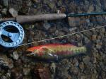 Nice pics. shark diver, Thats a bueatiful golden ! I'll agree 100 % it is not a full on bass type hook set, It's a slight flick of the wrist, It's something you develop a feel for, I'm still workin on it. otherwise your gonna spend alot of time in the trees, or may even see a small trout go flying by your head . It dosen't take much pressure to set that small sharp hook firmly. Lately I have not used an indicator, I preffere to high stick lately, wading to put myself into position so as not to have to cast and use an indicator. I also think the quality of rod used is a big part of detecting strikes, everyone always talks about a rods ability to cast, Well i dont find myself casting more then 20 or 30 feet very often and I feel most of the strikes I get. Of course indicators have there time and place but I just personally do not like to use em if I dont have to. One last thing, The largest fish I have hooked in any trout water in the last 2 years was at putah and I thought I was snagged, there i was standing there jerkin my rod up and down and all of a sudden a trout that was easily in the high 20's starts swimming towards me, He got in the fast water and I had no chance, That fish was spawned out to ! I could only imagine him in his prime, That dude would have been a freakin rocketship !