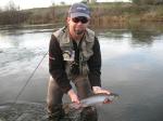 I went out yesterday with two buddies. We fished from 9 am to dark. Between the 3 of us there were 5 hook ups and only 1 to hand. We didn't get any action at all until 5 pm. We parked at the hatchery and walked down to the island. There were already 7 guys at the top of the chute next to the island so we went back upstream to the riffles section. We did see a couple of fish hooked by those guys. At lunch we drove down to Sunrise and tried there for a few hours then headed back up to the hatchery with hopes of getting a spot near the chute. Wrong, there were 13 guys there now so we continued to fish the riffles. All fish came on some type of black streamer. I was using a black bunny leech, one buddy was using a black and purple thing with barbell eyes he tied and the other guy was using a big black and purple bugger. I think if the weather was not so nice we could have done better...a cloudy sky would have helped. These are pics from the only fish landed from hook up to net to hand.