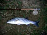 Got it on the reel after about 10 seconds and it started ripping line off the reel, I thought there is no way this is a bass. Got it in closer and saw a light colored fish, I thought that is a huge squawfish, brought it in closer and saw the stripes.