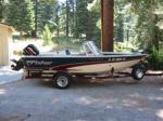 Fisher Hawk 170 FS Boat - 17 w/windshield, Aluminum Deep-V hull in very good condition, 2002 50hp 4-stoke Mercury outboard w/ extra prop and power trim, Minn-Kota electric trolling motor 55lb thrust w/Auto Pilot, Lowrance Depth/Fish finder, 2 batteries (cranking and deep cycle), AM/FM stereo w/cassette player, 2 live wells, 4 folding padded seats, rod holders, Bilge pump, running and anchor lights, halogen docking lights, rod storage, tackle storage and water ski storage, heavy duty boat/motor cover and summer cover, bimini top w/ full zip-up enclosure, painted trailer w/spare tire, excellent condition, garage kept.