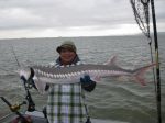Nice dinosaur. I used to do alot of that type of fishing. Last time I took the old boat out me and my good fishin buddy got these guys, I think the sturg. is 54" and the leopard was 56". Those leopard sharks are underated fighters. As for sturgeon, Pound for pound they don't fight very well. Now is a great time to sturgeon fish in s.f bay because the herring are spawning and the sturgeon gorge on eggs and dead herring.