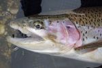 so djwatts and myself got up but o crack o dawn to get to the yuba early. cant believe there was already 2 cars already under the bridge and 3 on the other side. crazy people dont they have jobs. so we decided to fish the bridge for a lil bit then move upstream. i hooked up right off the bat with a nice 13"er. it felt pretty good on the new rod. and the boots man do they grip well. so worked out way up around the bend to where u can cross, wanted to fish the inside of the run but 2 people were fishing it already. so worked the seam on the east side of the river (also could be the south side which ever way u look at it). finally hooked into a nice fatty just under 20"s where the 3 islands come together, and it took a good amount of line, but finally got it all bank and to the net. thanks paul for running up the river to land that fish for me. its was a great fight, and the new rod took it well. from there we worked up a little farther, say 2 steelhead spawning which was very nice to see. then worked back down river. fished a few spots below some old salmon redds, thats where paul hooked into a nice healthy 14 incher, but just couldnt keep it on. after that went down stream a lil father and fished a run that is usually stacked with salmon and its about 2-300 yrds long. there are still a few salmon spawning, couple cheesed up and a few chrome ones. but no fish behind them. then we moved back up to the bridge and the fishing turned on. didnt have to much time left to fish i did a quick down one side up the other, and withing about 45 mins i hooked 4 and landed 4. on 8" dink the others the usual 16-18"ers. so all in all a great day on the river, and paul gettin some more experience with his fly fishing game.