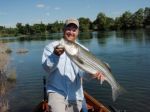 It’s been a little dead around here on the boards. Its either people are catching fish and not posting, or the fishing just sucks. Lately its been all about the Shad and stripers. For me the stripers have been tough, the shad a little easier. But the flows and cold water are really putting a hurtin on those 2 species. Well with the cold weather the past few days the fishing was been beyond poor. Downright miserable. But with the sun comes active fish, and hopefully some boils. And sure enough we found some on the American today. But the real reason for this post is my new project that I picked up today, that I will be updating on a regular basis until it is completely redone. I bought a 16ft Greg Tatman wooden drift boat today, and gave it its maiden voyage on the AR today too. What a popping of the cherry. No better way than with a beautiful 20lb Striper on the FLY. Finally after countless hours on the water, searching for the one, I finally got her. So not only have I fallen madly in love with striper fishing, but the wooden drift boat is unexplainable. Even in its not so great condition, it really sets the tone of the trip. Gives you a sense of how it was in the older times before aluminum and fiberglass. Its majestic, it’s..........almost a Romantic feeling on the water. Something about it I just can’t explain. But what I will do is continually upload photos as it is a work in progress and till it’s all done, and looking like new. Here are a few pics to start you off from today’s trip.