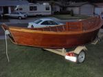 Been very busy. 12 hours a day since 6/8, and as of today she is put back together. A few minor things that need to be done. Mainly the lean bar in the back. Its all cut out with one side stained. Going to put 2 coats of stain then 2 coats of varnish then onto the boat it goes. The other thing is putting on the, what i call, "Its Skirt". the black runner that goes along the bottom of the boat. The another last coat of gloss varnish on the exterior, then it will be a waiting game for everything to cure. 2-3days minimum. But with it hitting 90 on Tues, it might be sooner than that. But it will be ready for travels by the Fundraiser. Figured id bring it out and leave it hooked up in the parking lot for those that would like to check it out.