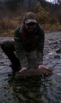 Petey's most memorable PC experience occurred a few years ago at low flow when he hooked a Monster Buck (he distains calling these fish hogs or pigs) below the bridge that took off down the staircase riffles with Petey right behind. Petey estimated this fish to be 42", "if he were a centimeter" and Petey seemed to be getting the upper hand when he slipped on a small boulder, landed on the back of his head and temporarily lost consciousness. The fish took advantage of this temporary set back and managed to come unbuttoned. He admitted he looked all winter for that fish for a rematch, but it was not to be.