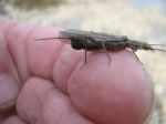 I would tie some with a black body and legs-they are a dark fly, about 1-<1.5" long, 0.25" or less in body width, narrow wings